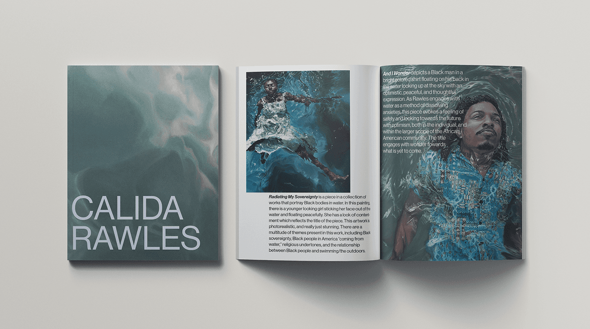 I researched Calida Rawles’s work to create a design that reflects her artistic style and voice. The color palette, typography, and layout were chosen to highlight her art while maintaining a clean, engaging flow. The pastel colors were chosen in order to both compliment her work and set the tone of the work presented to be energized. The goal was to create a visually cohesive zine that connects readers to her work in a personal and accessible way.