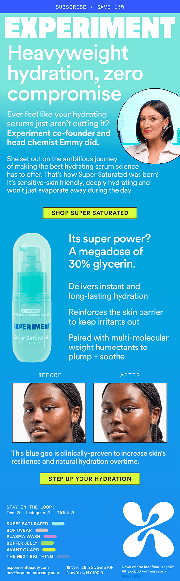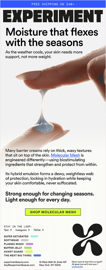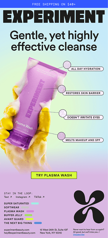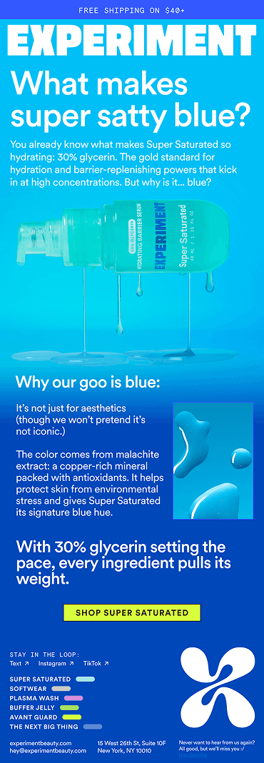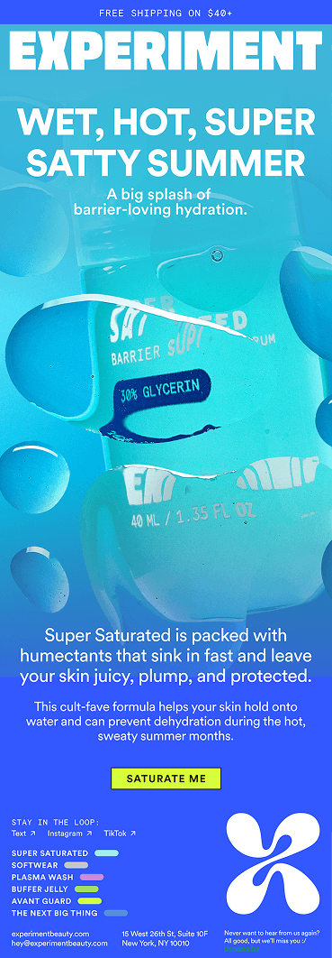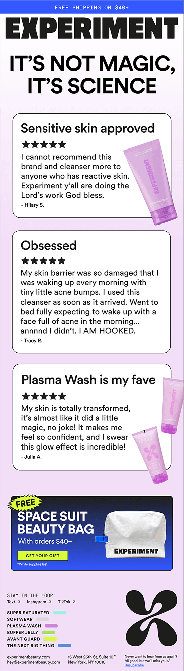 Every product within Experiment has its own distinct color palette, tone, and design treatment, and I adapt each email’s layout, typography, and imagery to reflect that unique personality while ensuring visual harmony across the broader brand ecosystem.
