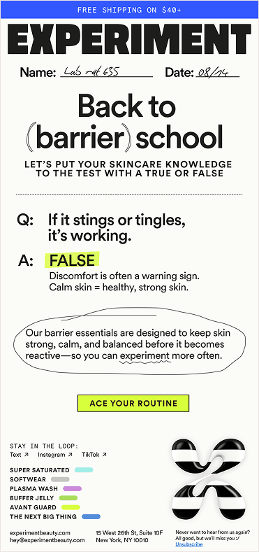 Experiment Beauty is a bold, science-driven skincare startup that challenges industry norms with innovative, sustainable products and a "hot & smart" aesthetic.